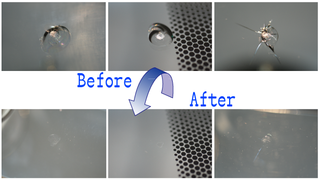 ※ガラスにヒビ割れが出来てから、時間が経てばそれだけ割れた部分からゴミや塵が入ってきます。 出来るだけ早めの修復をオススメしますが、それまでヒビ内部にゴミや塵などの異物が入らないように傷口はテープなどでふさいでください。